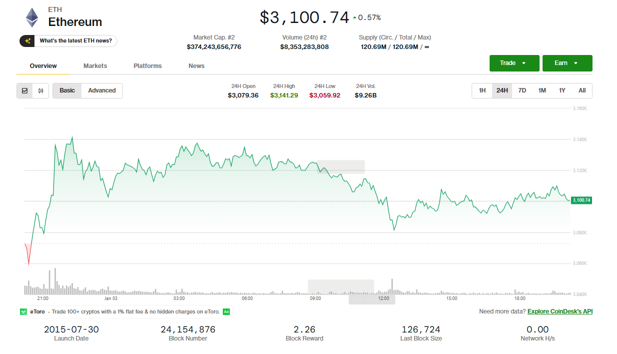 Ethereum trading near the $3,100 level, showing short-term consolidation in a large-cap asset. Source: CoinDesk.