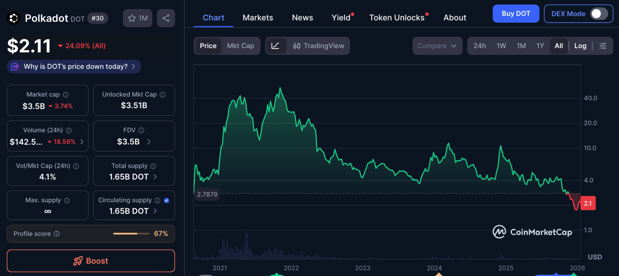 Polkadot remains a strong infrastructure project with a focus on interoperability and modular blockchain design. Its technology remains relevant, even as competition across L1 and L2 platforms has intensified. But at roughly $2.11, DOT continues to trade below earlier highs.