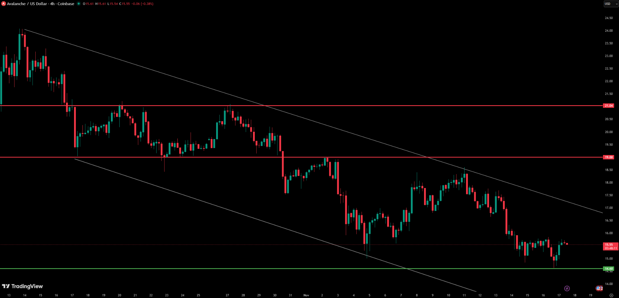 Avalanche continues to coil inside a downward channel, although the latest double-top pattern and strong bullish candle imply potential early stabilization. The Avalanche price is seeing some good movement, and if this momentum maintains, AVAX could rise toward the $19–$21 level.