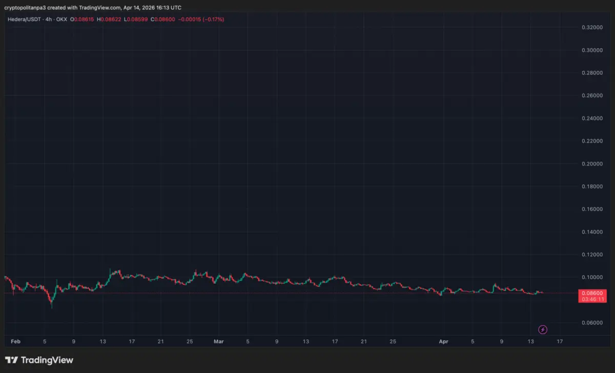 Hedera trades at $0.08610, down just 0.06%, with the 4H chart showing a prolonged sideways grind since mid-February. Price bottomed at $0.079 on February 6 before recovering to $0.110 by February 13 — a brief 39% bounce — but has since drifted relentlessly lower, compressing into an extremely tight $0.085–$0.100 range for nearly two months. Candles are microscopic with virtually zero directional conviction — deep accumulation or capitulation territory. Support sits at $0.082–$0.085. Resistance at $0.095–$0.100. A break below $0.082 risks $0.075. Recovery requires a sustained break above $0.100 with volume. Momentum is flatlined and directionless.