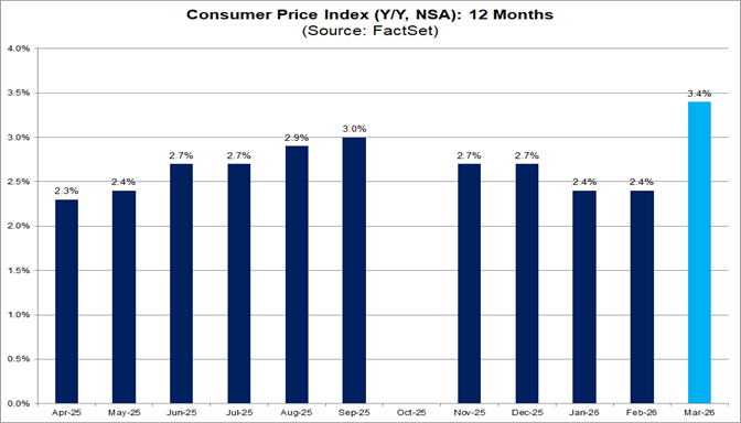 Economists have been bracing for this print for weeks. FactSet’s median estimate for March CPI sits at 3.4% YoY, while the broader FactSet consensus puts the number at 3.7% on an annual basis, with headline inflation rising 0.93% month-over-month, the biggest single month jump in years. Meanwhile the Cleveland Fed’s Inflation Nowcasting model is in the lower bound of the range and has it at 3.16%. As Morningstar reported, this CPI report is going to be the first real data set to reflect the surge in energy prices from the Iran war. Oil has shot up from around $70 before the war began to over $110. An over 70% rise that wasn’t limited to the pump. It moved into jet fuel, shipping costs, food transportation and eventually, the price of almost everything that gets trucked, railed or shipped across the country.