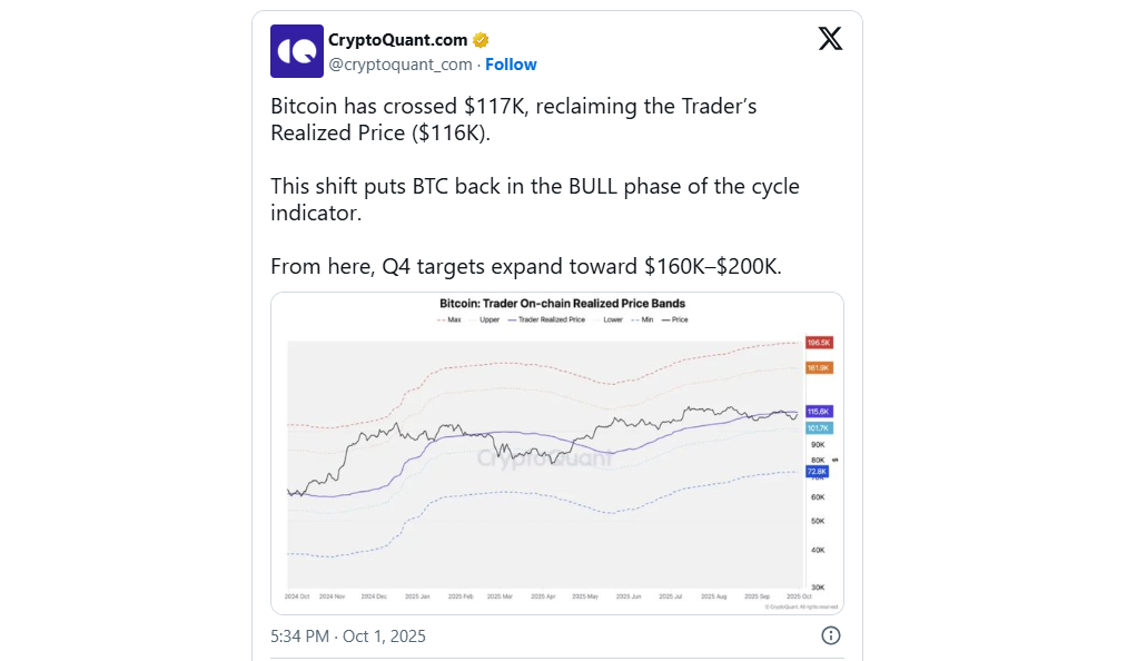 CryptoQuant has explained that with the price of Bitcoin reclaiming the Trader’s Realized Price ($116K), it is now set up to rally higher. According to the on-chain analytics firm, Bitcoin has reentered the bull phase, and the BTC price could rally to $160K-$200K.