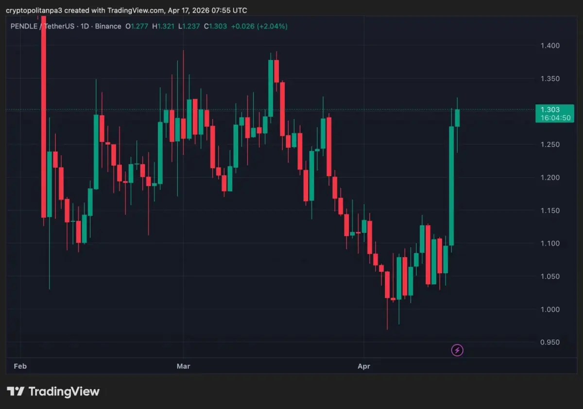 Pendle trades at $1.303, up 2.04%, with the daily chart on April 17 showing a brutal downtrend since January 2026. Price collapsed from highs near $3.00 to a February low of $1.03, a 67% decline, before a brief March recovery to $1.39 failed immediately. April brought another leg lower to $0.975, breaching the $1.00 psychological support, before today’s sharp recovery to $1.303. This is the strongest single candle since February, a potential short-term reversal signal. Key resistance at $1.30–$1.35. Support at $1.10–$1.15. Bulls need to hold $1.25+ to confirm recovery. Structure is bearish but showing first signs of life.
