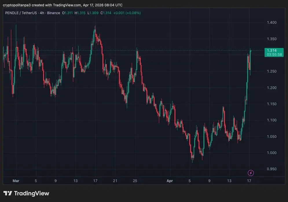 Pendle trades at $1.314, up 0.08%, with the 4H chart revealing the full extent of the recent selloff and today’s explosive recovery. Price peaked at $1.39 on March 17 before a relentless collapse through $1.20, $1.15, and $1.00 by early April, bottoming at $0.975. Since April 5, price has been grinding higher in small steps from $1.05 to $1.10 before today’s vertical surge to $1.314, the strongest 4H candle in weeks. Price is now testing a key horizontal resistance at $1.30, a level that has repeatedly capped bounces since March. A hold above $1.30 targets $1.35–$1.40. Momentum is sharply improving.