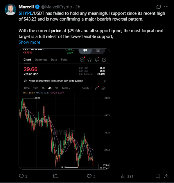 The analyst reveals that the Hyperliquid chart now points toward a full retest of the lowest visible support and may continue to drop from $29 if selling pressure persists. HYPE must stabilize around the current level to stop its downward momentum.